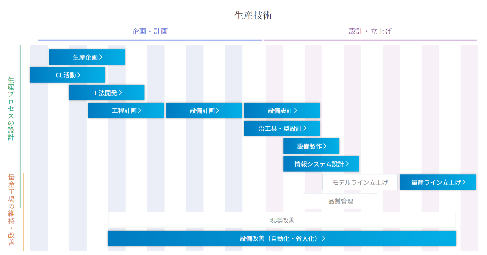 弊社は1959年の創立以来、自動車、航空・宇宙、FA・ロボティクス、エレクトロニクスなど、多様な分野における生産工程の技術支援に取り組んでまいりました。各分野の特性や設計思想を理解し、特殊な部品・製品・製造機器に精通したエンジニアを多数抱え、小規模の専用設備から大規模生産ラインに至る様々な現場で技術支援を行っております。本サイトは、新人技術者や生産技術エンジニアを目指す人たちにとっての教科書や参考書、各工程に携わる現役の生産技術エンジニアが指導や後進育成の際に利用いただくことを目指し、コンテンツを拡充してまいります。