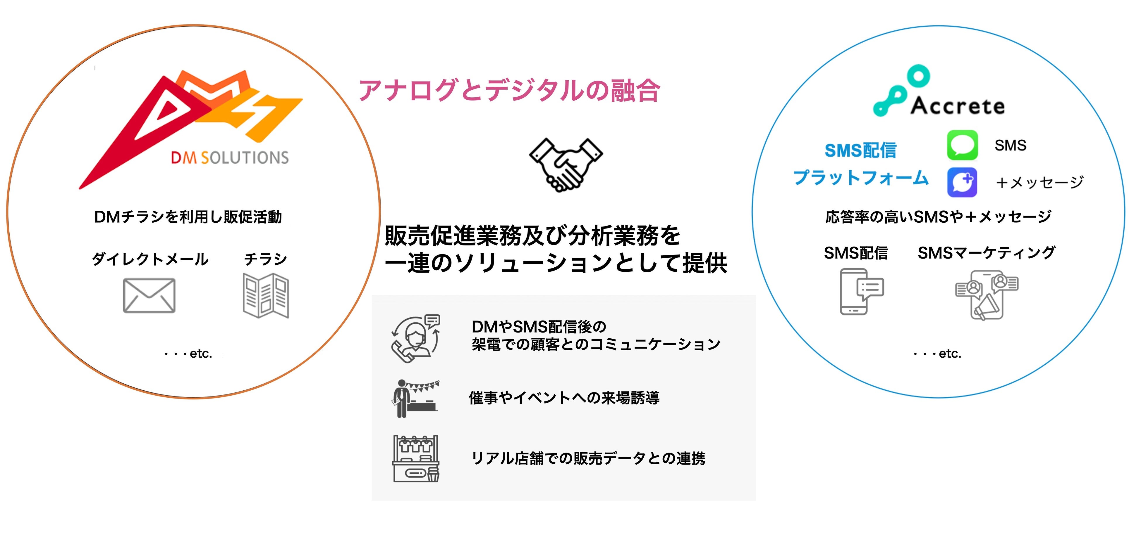 今回、紙媒体を主なコミュニケーションツールとして利用しているDMソリューションズの顧客企業に、アクリートの提供するSMSや+メッセージによるテキスト広告やデジタルチラシを組み合わせること、反対にSMSを主要なコミュニケーションツールとして利用しているアクリートの顧客企業にDMソリューションズが提供するダイレクトメール発送サービスを提供することで、両媒体の強みを生かした効果的な販売促進サービスを一連のソリューションとしてご利用いただけるようになり、それぞれ別個のサービスとして利用するよりも低価格でのサービス提供を可能とし、お客様の利便性の向上及びマーケティングの効率化を図ります。
