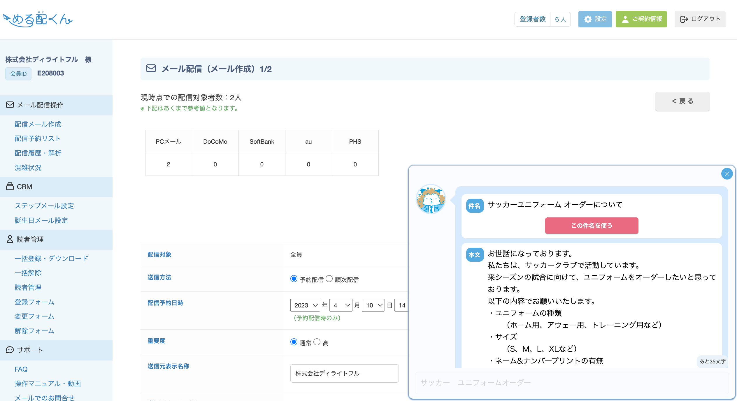 株式会社ディライトフル(東京都江東区)は、当社が運営するメール配信システム/SaaS「める配くん」に、新たにChatGPTでメール本文を提案される機能をβ(テスト)版として追加いたしました。