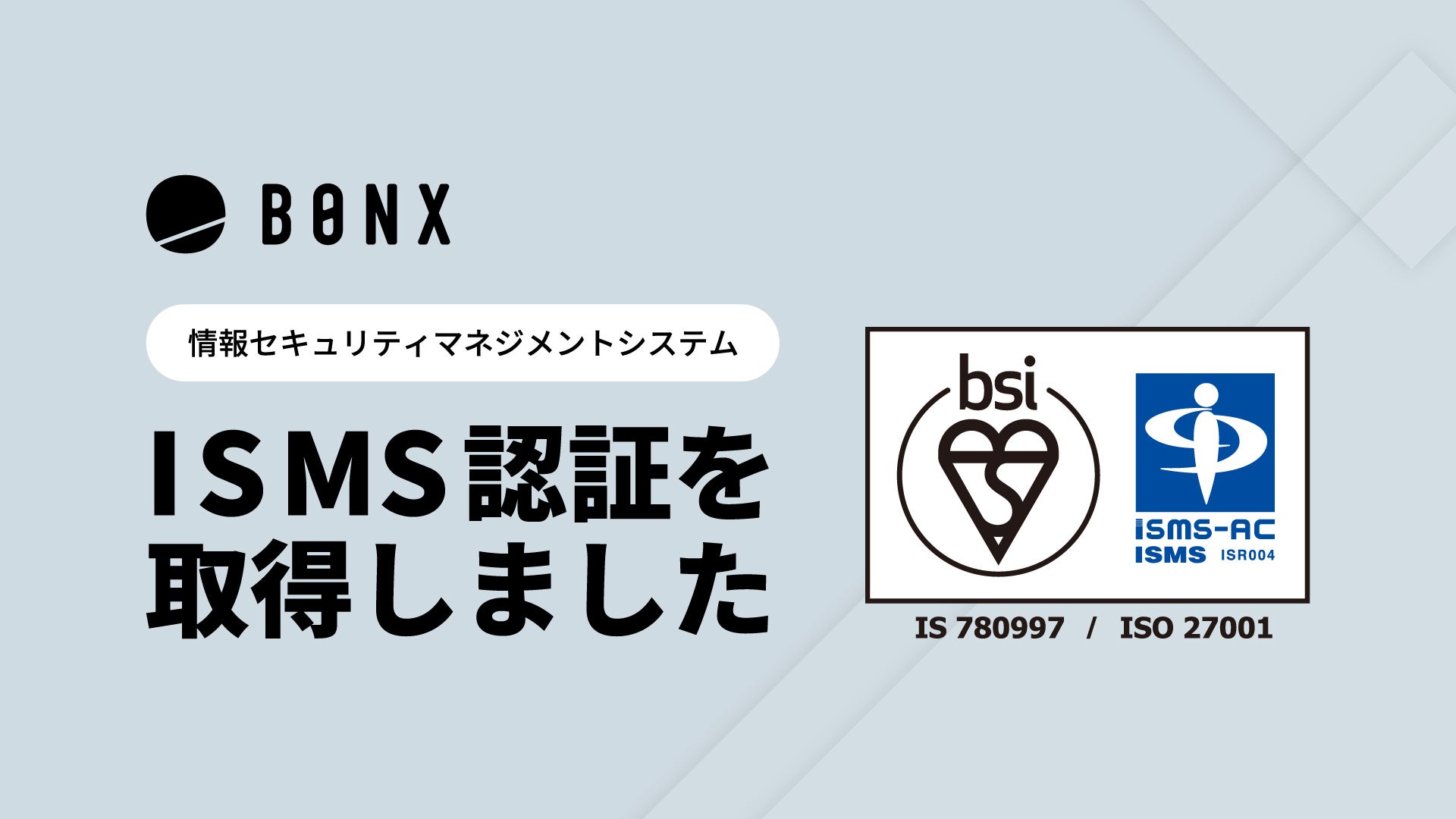 今回「ISO 27001」認証を取得したのは、BONXの情報セキュリティに対する管理体制や、セキュリティ要件、及びプライバシー情報の管理体制について、国際標準規格に適したものであるということが第三者機関に認められたことになります。