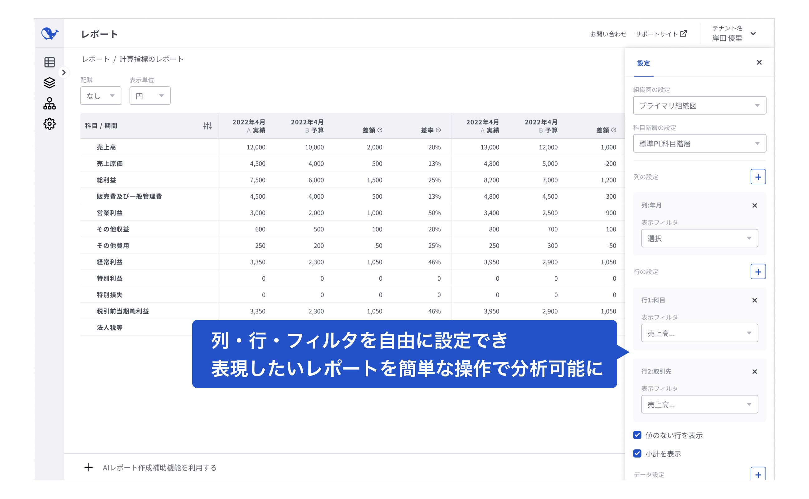 「2023年1月から3月の予実を教えて」などの自然言語での質問を入力することにより、複雑な操作を覚えなくても、「推移表」「対比表」などの分析データの可視化が可能となります。