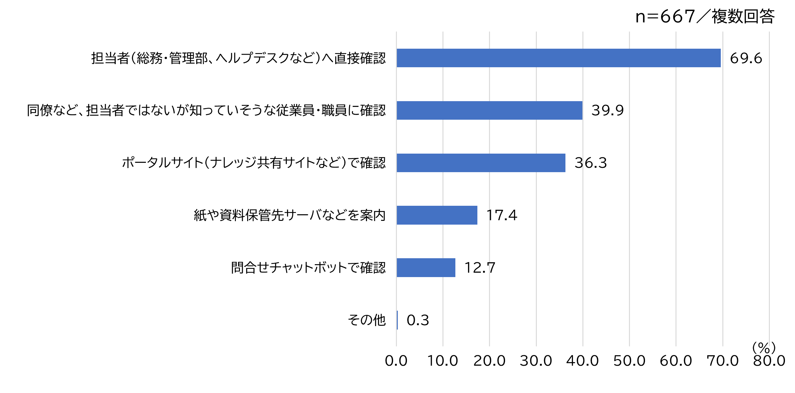 社内問い合わせ方法について、 「担当者に直接確認(総務・管理部など) 」 が69.6%で最多