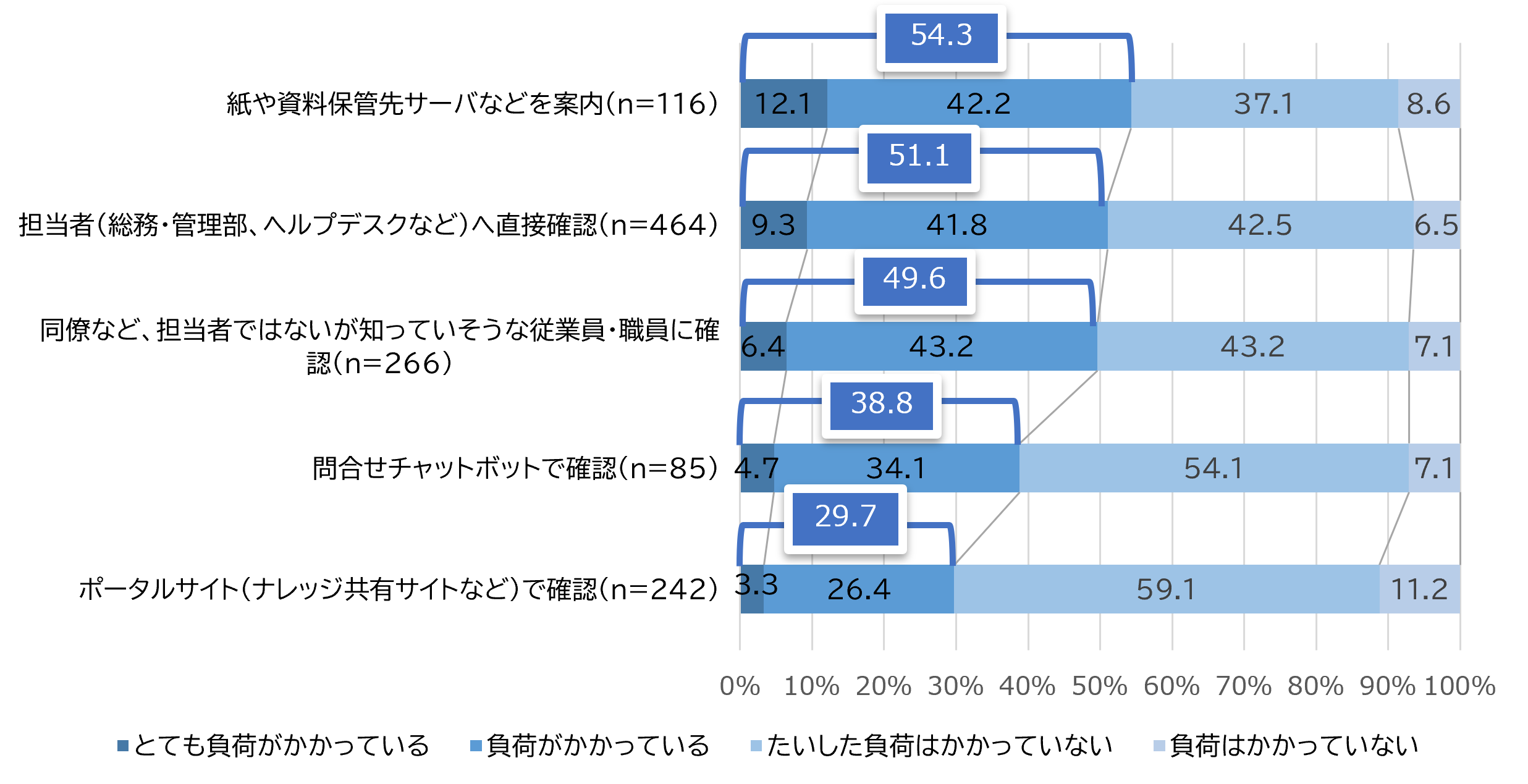 それぞれの解決方法について、「とても負荷がかかっている」、「負荷がかかっている」と回答した割合は「紙や保管先サーバを案内」が54.3%と最も高く、次いで「担当者(総務・管理部など)」に直接確認」が51.1%でした。