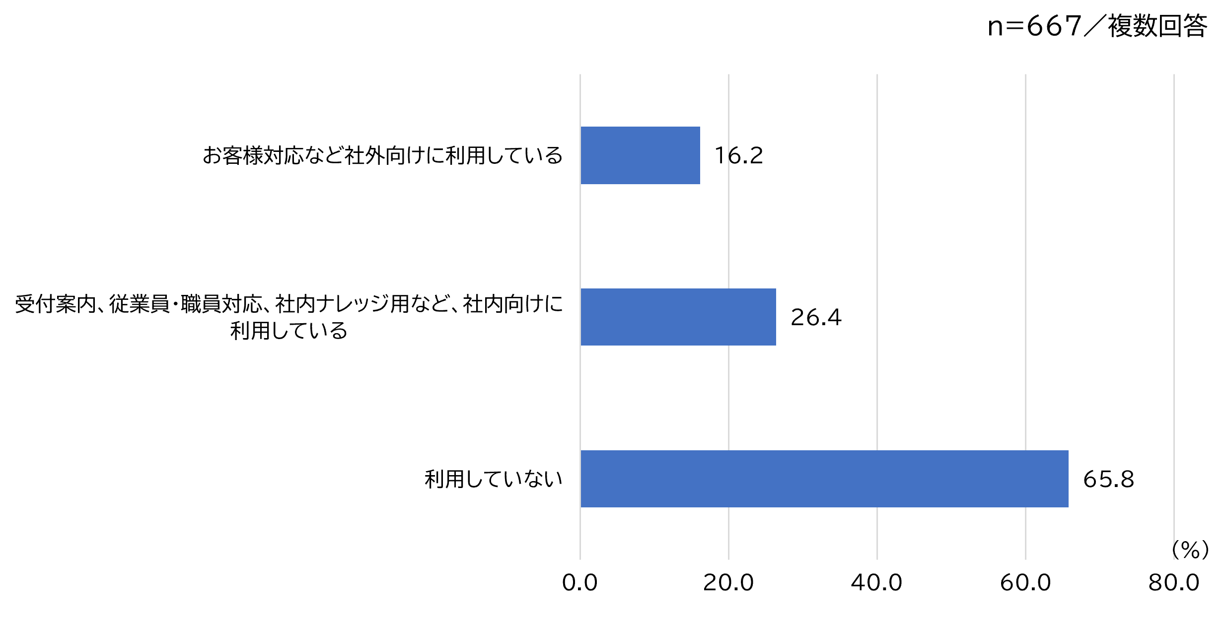 職場におけるチャットボットの導入について、 「社内向けに利用している」 が26.4%