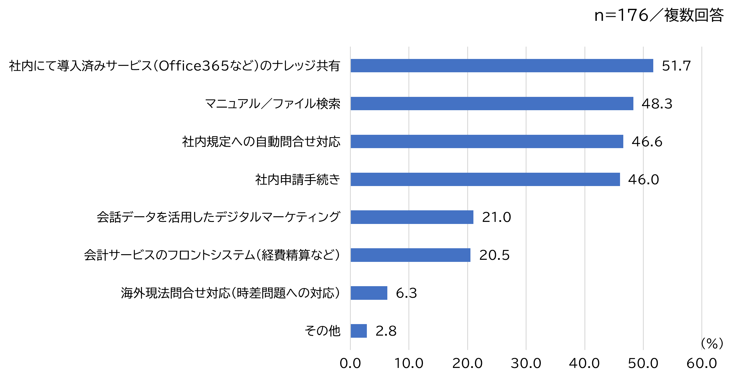 「社内向けに利用している」と回答した176名に、「チャットボットの利用シーン」について聞いたところ、「社内にて導入済みサービスのナレッジ共有」が51.7%で最も多く、次いで「マニュアル・ファイル検索」が48.3%となりました。