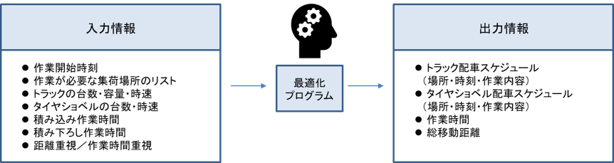 AIプログラムは、集荷希望日・集荷場所、タイヤショベルやトラックの台数、優先したい条件(時間や距離等)を入力すると、タイヤショベルとトラックの最適なルートを地図上に表示します。