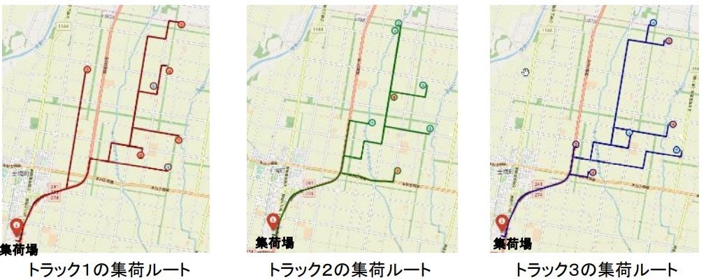 集荷場をスタートし、圃場(21拠点)を回りトラック1~3と落ち合い積荷作業を繰り返します