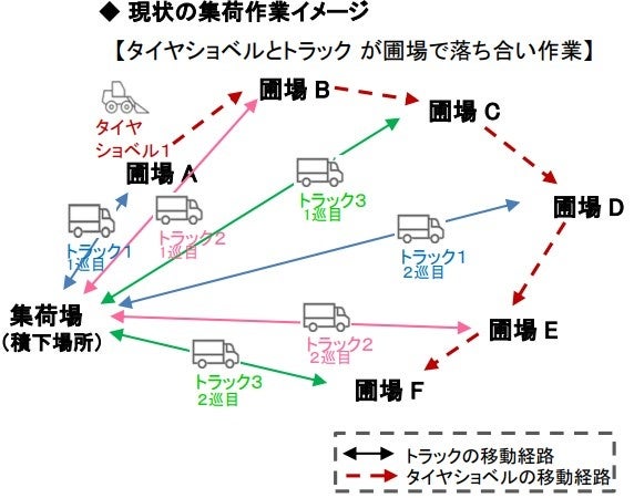 タイヤショベルやトラックは、台数や運転手に限りがあることから、集荷待ちにより農作物が劣化することがあります。この事から、農作物を効率的に集荷する必要があります。