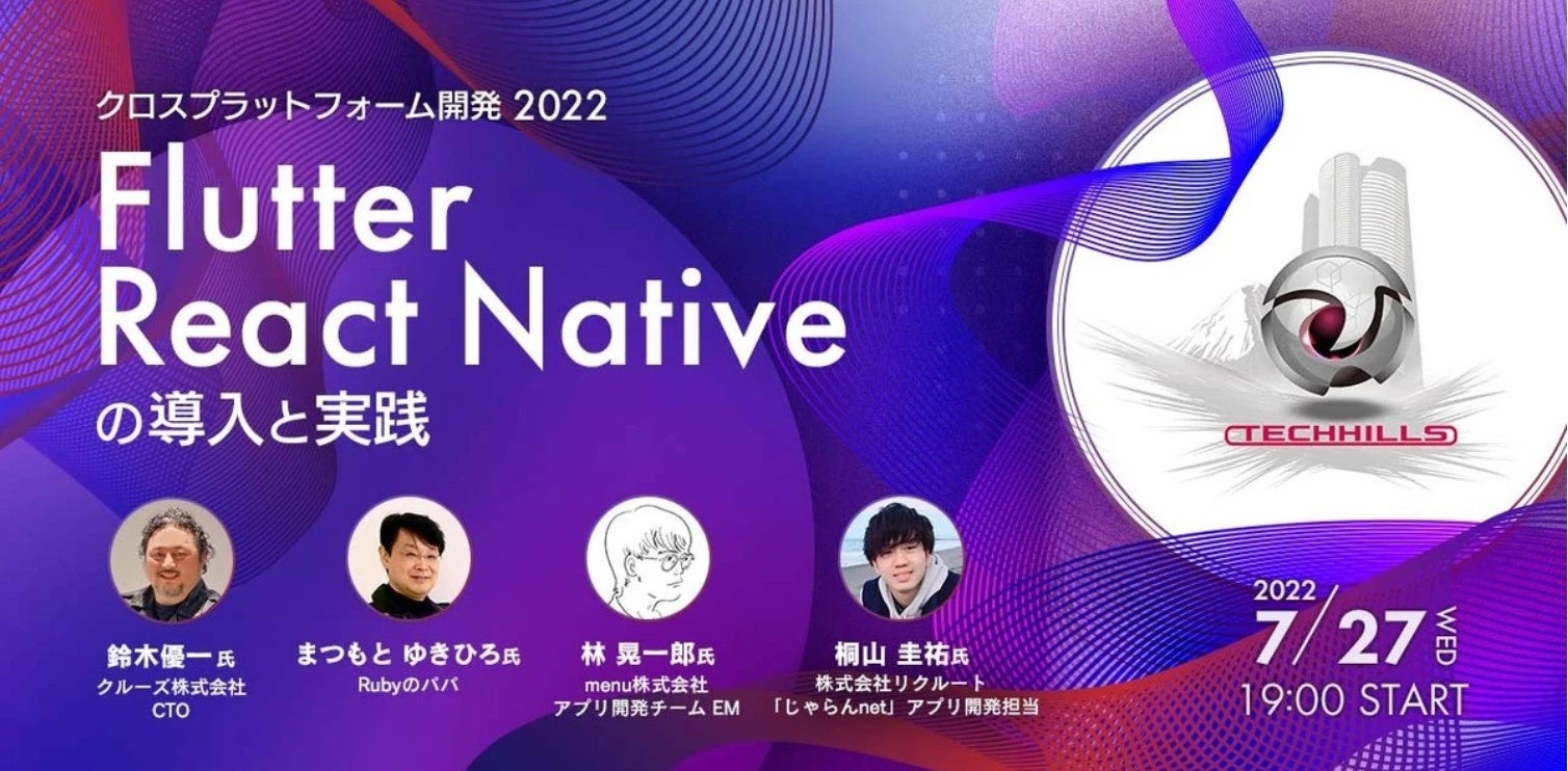 今回の『テックヒルズ』では、アプリ開発で注目されている「Flutter」「React Native」を用いたクロスプラットフォーム開発という大テーマでクルーズ、リクルート、menuが取り組んだ事例をもとに、導入の背景や苦労した話を通し知見を高めていくイベントとして開催致します。