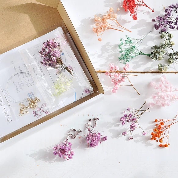 本物のかすみ草を使ったイヤリングを手作りできるキット。ピンクやグリーンなど9種からお母さんに似合う色を選んでください。プレゼント用のBOXもオプションでつけることができます。