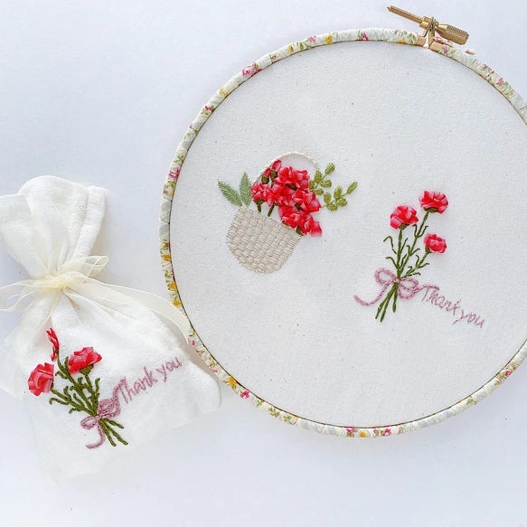 図案通りに縫うだけで、花びらの質感が美しい本格的な刺繍を施すことができます。ハンカチや巾着など、ちょっとしたワンポイントにおすすめ。
