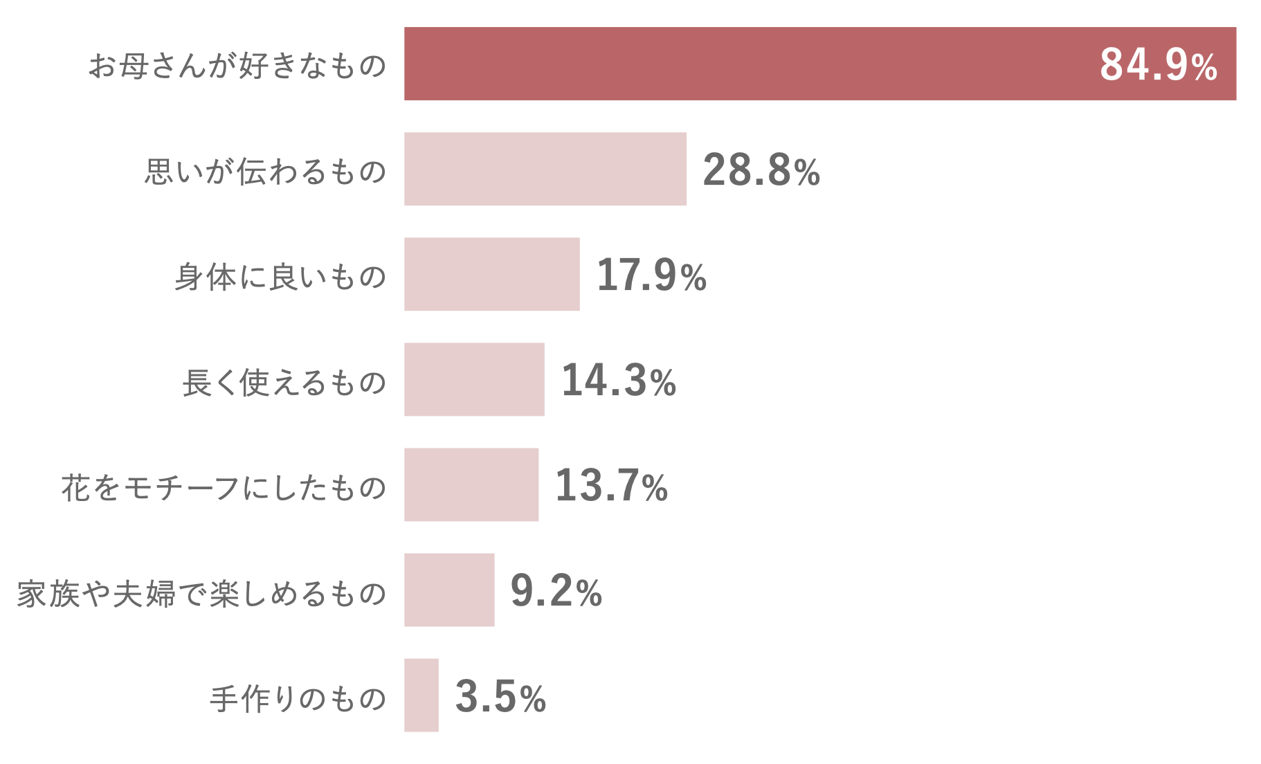 Creemaでは、子ども側とお母さん側の両方にアンケートを実施し、母の日にあげたいものと、欲しいものをそれぞれに伺いました。その結果、子ども側があげたいものとして「お母さんが好きなもの」が84.9%で一位にランクイン(図①)。 お母さんに喜んで欲しいという気持ちから、好みのものをプレゼントしたいと考える人がとても多い結果になりました。一方、お母さん側に欲しいプレゼントについて聞いたところ、「子どもの思いが伝わるもの」が66.4%で一位に(図②)。 双方のプレゼントへの考え方にはギャップがありそうです。