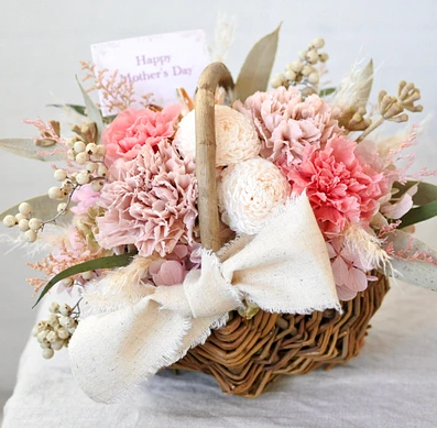 優しいピンクのカーネーションとダリアを、自分でフラワーバスケットにアレンジできるキット。ブリザーブドフラワーなので長く楽しんでもらえるのが嬉しいポイント。