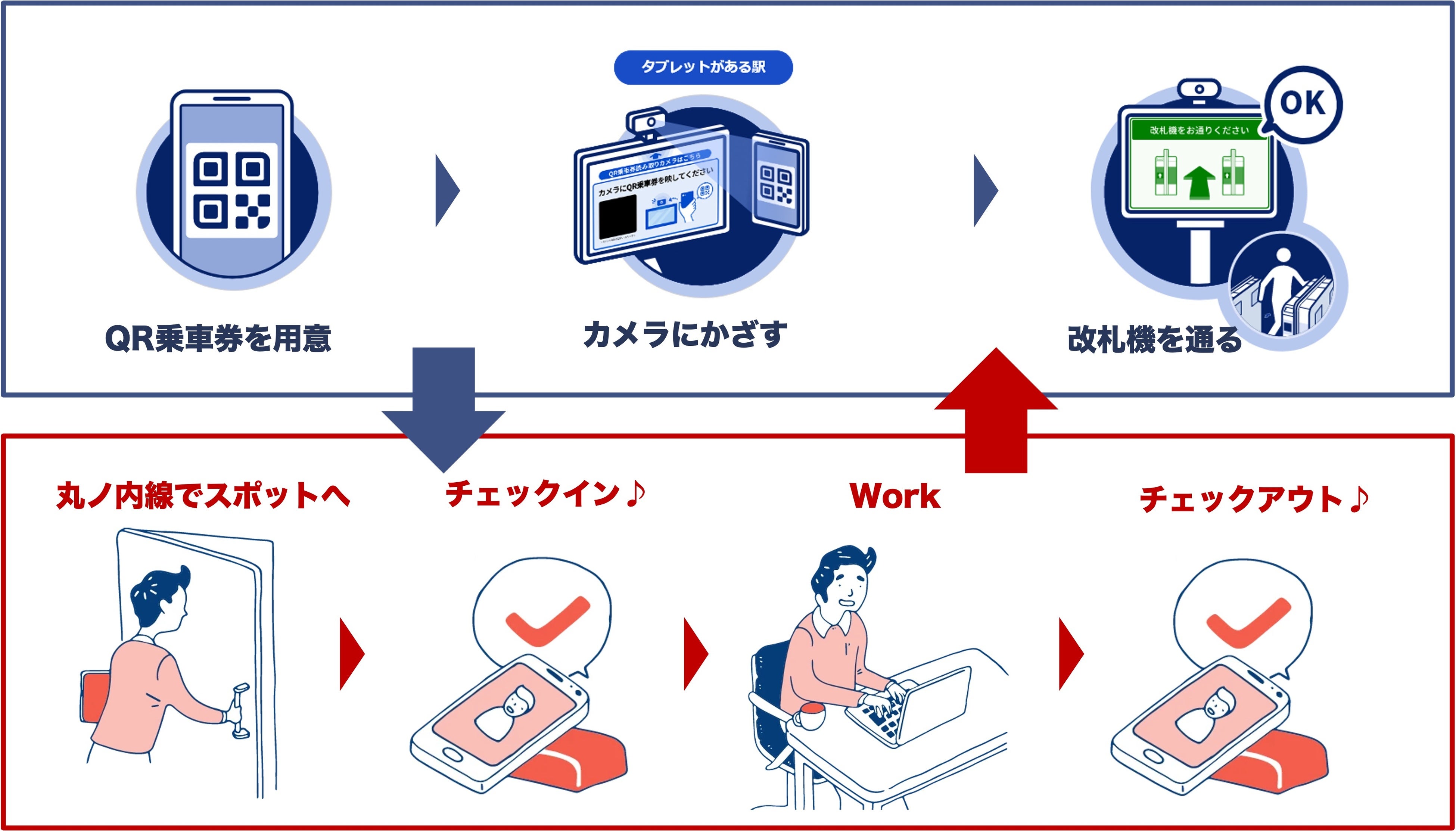 利用者はvia-atアプリをダウンロードしてアカウント登録をします。アプリから本実証でのサービス利用予約をして、「丸ノ内線デジタル1日乗車券」を購入します。丸ノ内線の乗車はvia-atアプリで表示されるQRを改札でかざすか読み取りをしてもらうことで乗車ができます。ワークスペース等の施設ではスマホを現地設置のICタグカードにかざすことでアプリを立ち上げチェックインやチェックアウトをセルフで行い利用をします。