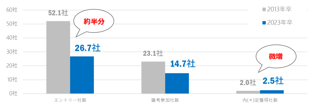 2013年卒の新卒採用は、金融危機~世界的な経済の後退から回復へ向かう直前におこなわれ、大卒求人倍率*1は1.27倍。他方、2023年卒の新卒採用は、コロナ後を見据えて各社の採用意欲が回復し、大卒求人倍率は1.58倍。就職活動量の差には、いわゆる“買い手市場”か“売り手市場”かの違いが明確に表れていますが、さらに、この10年で就職活動が大きく様変わりしたことも影響していると思われます。