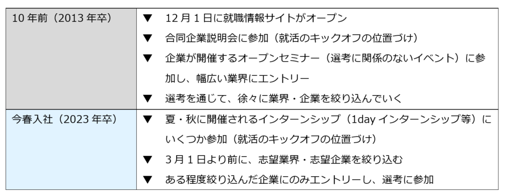 10年前、「就職情報サイトのオープン」と、その後すぐ開催される「合同企業説明会に参加すること」が、就職活動の“キックオフ”の位置づけでした。その後、幅広い業界の企業にエントリーし、オープンセミナー(選考に関係のないイベント)に参加し、徐々に志望業界を絞り込んでいく――本格的な採用活動が始まったあとに、就活を通じて自身の志向を考え、志望業界を変更する時間的な余裕があったといえます。対して、現在の学生にとっては、夏・秋に数社のインターンシップに参加することが就職活動のキックオフ。本格的な採用活動が始まる前に志望業界を絞り込み、その業界の選考にのみ参加する“狙い撃ち”の就活が一般的となっています。
