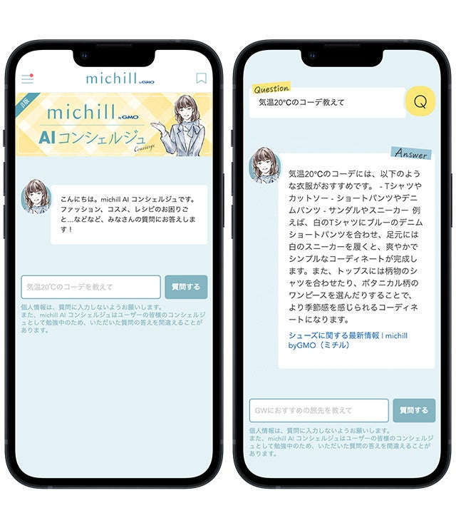 GMOインターネットグループのGMOアドパートナーズ株式会社の連結会社で、メディア事業を展開するGMOインサイト株式会社(代表取締役社長執行役員:徳永 伸一郎)は、運営している20代・30代のためのライフスタイルメディア「michill byGMO」(https://michill.jp/)において、OpenAIが開発した人工知能(AI)チャットボット「ChatGPT」を活用し、ユーザーの疑問や質問に対して、リアルタイムで情報提供やアドバイスができるAIチャット機能「michill AIコンシェルジュ(β版)」を、2023年4月11日(火)より提供開始いたしました。