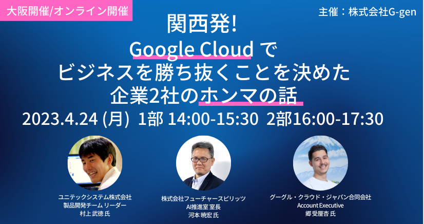 本セミナーでは、Google Cloud &G-gen を選択された関西にゆかりのある企業2社様(フューチャースピリッツ様、ユニテックシステム様)をお招きして、Google Cloud を利用された経緯、なぜ Google Cloud を選択されたのか、現在どのようなサービスを利用されているか、利用される上でメリットを感じている点など、本音やリアル(えぇ話)を語って頂きます!
