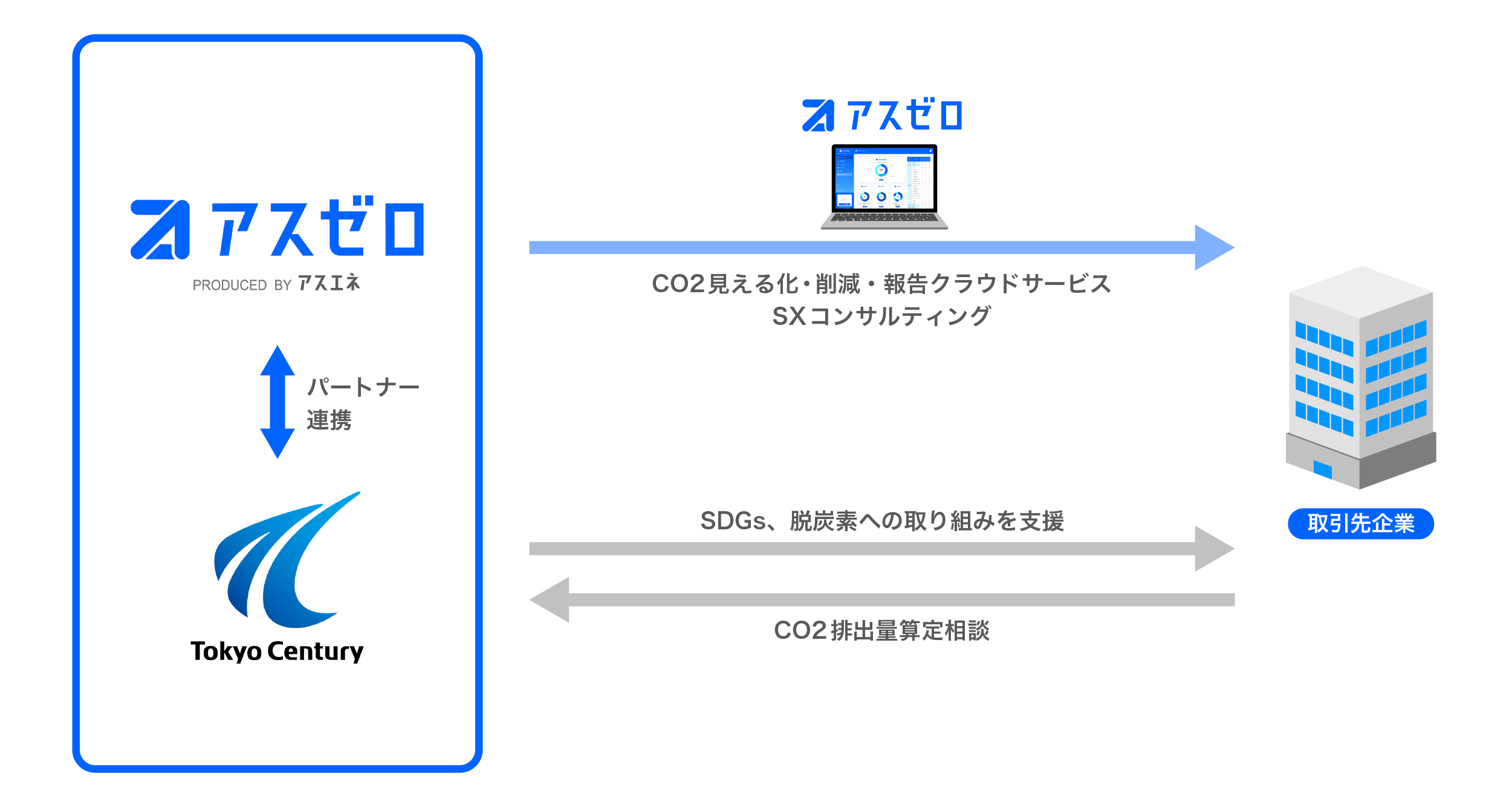 この度の提携により両社は、東京センチュリーの取引先に対して、「アスゼロ」ならびに脱炭素ソリューションなどを提供します。さらに今後は、リース資産の管理・CO2排出量見える化など、互いの強みを活かしたCO2排出量の削減につながる新しいサービスを提供することを視野に入れるなど、企業の脱炭素化および日本のネットゼロ実現を目指し、協業を推進していきます。