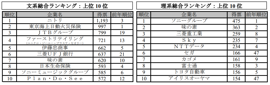 - 理系総合:「ソニーグループ」が2年連続1位、2位に「味の素」がランクインした。3位「三菱重工業」は前年8位からランクアップ。6位の「セガ」と10位の「アイリスオーヤマ」は共に前年47位からトップ10入りし、大幅なランクアップとなった。