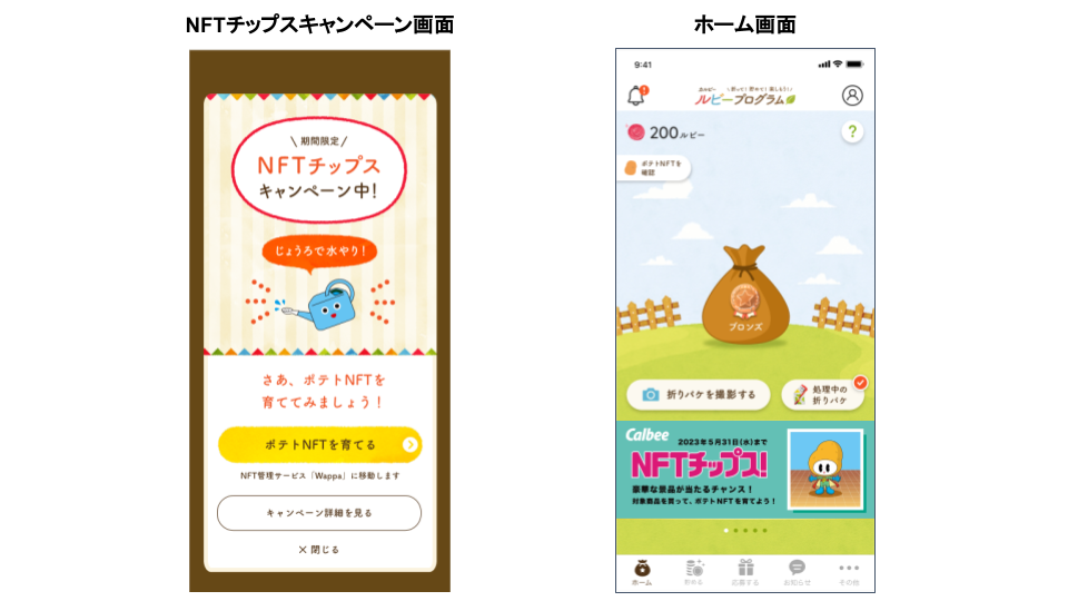 (1)カルビーの対象商品をご購入後、カルビーのスマートフォンアプリ「ルビープログラム」で折りパケを登録していただいた方に「ポテトNFT」を無料配布いたします(配布上限に達し次第終了)。