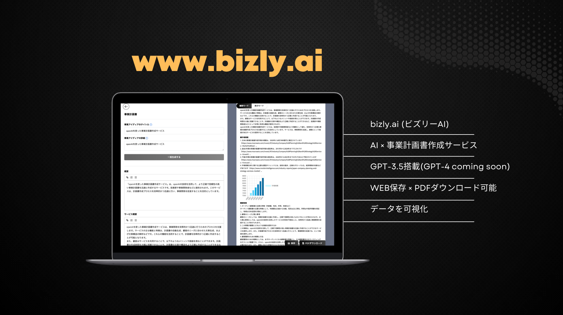 bizly.ai(ビズリーAI)は、わずか300文字の事業アイディアを入力するだけで、AIが市場規模、顧客ターゲット、競合状況、マーケティング戦略、財務計画、資金調達、リスクマネジメント等について分析し、短時間で構造化された事業計画書を生成します。OpenAIを活用した当サービスは、時間とリソースの節約、質の高いコンテンツ生成、ビジネスアイデアのブラッシュアップ、そして資金調達の成功確率向上を実現します。ビズリーAIを使って、事業計画立案のプロセスを効率化し、あなたのビジネスを次のステージへと導きます。