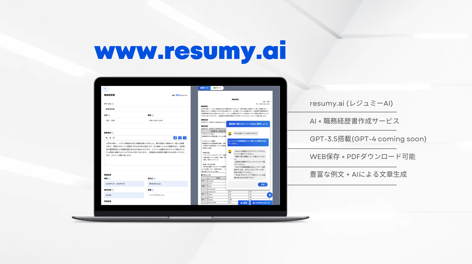 RESUMY.ai (レジュミーAI)は、就職活動において、職務経歴書作成に苦労している人たちの悩みを解決するために開発されたサービスです。
