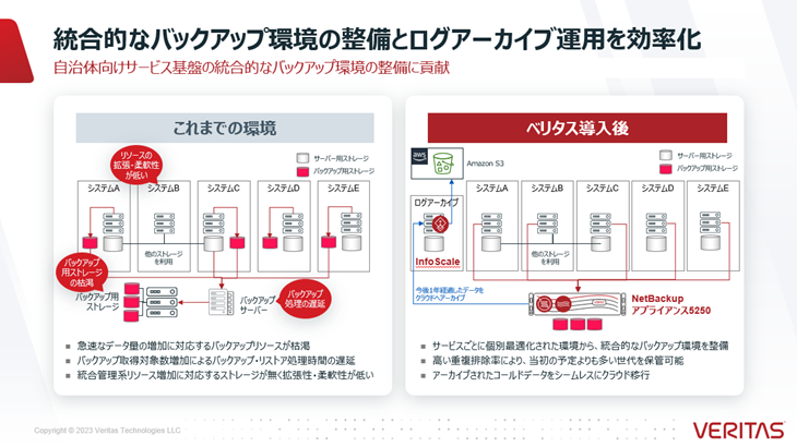 ベリタスの代表執行役員社長の金光諭佳は、次のように述べています。「自治体向けのIT基盤提供には、特に統合化による運用性の向上と、クラウド活用を含め迅速かつ柔軟に拡張できることが重要です。その点を評価していただいたことを大変嬉しく思います。この事例が他の自治体の課題解決にもお役に立てればと考えております」