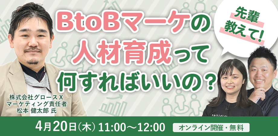 (本社:東京都渋谷区、代表取締役社長:齊藤和馬、以下「Innovation & Co.」)は、株式会社グロースX マーケティング責任者の松本 健太郎 氏に聞く、「先輩教えて!BtoBマーケの人材育成って何すればいいの?」をテーマとしたセミナーを2023年4月20日(木)に開催いたします。