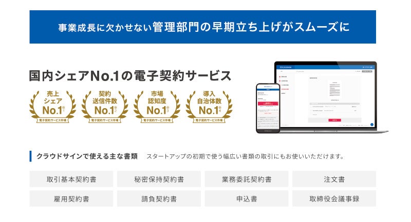 クラウドサインは、契約の締結から管理までデジタルで完結させる契約マネジメントプラットフォームです。電子署名法に準拠した電子署名とタイムスタンプによって円滑かつ、安全な契約締結を実現します。また自然言語処理技術を用いたAI契約書管理機能、契約書の振り分けのオートメーション化を実現したスマートキャビネット機能など、様々な契約管理機能により、過去に紙で締結した契約を含め一元的に検索・期限管理ができます。電子契約市場においては2015年の提供開始以来、企業や自治体などで幅広く導入されている、No.1 ※のサービスです。