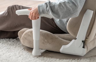 座ったままの状態で座椅子が丸ごと360°回転できます。座椅子はチェアと違い座ったままの状態で下がることが難しいため立ち座りしにくいですが、こちらのゲーミング座椅子なら、座ったまま回転できるので、立ち座りや近くのモノをとるときにも便利です。