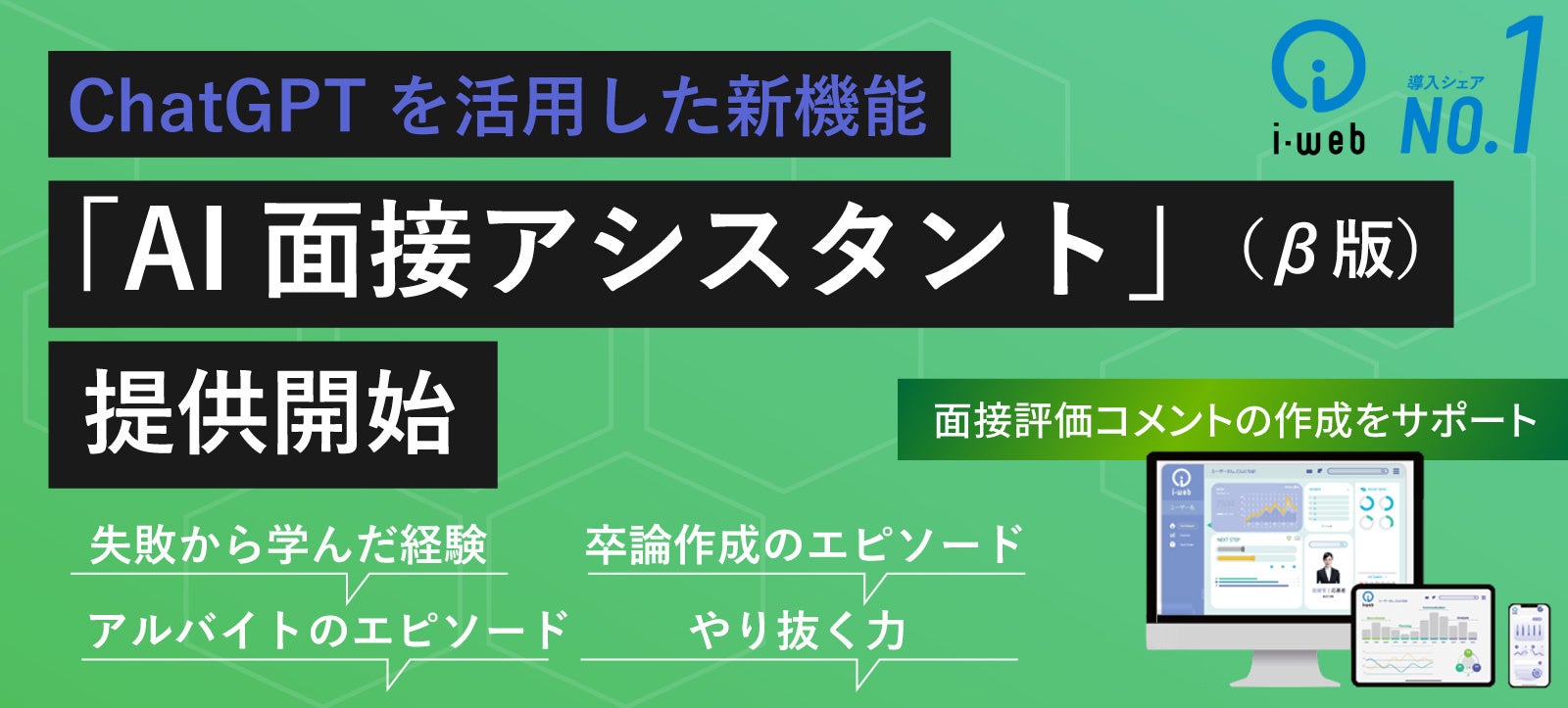 そこで、ヒューマネージでは、導入シェア第1位の採用管理システム『i-web』に、ChatGPTを活用した新機能「AI面接アシスタント」(β版)を搭載し、面接官の面接評価コメントの作成をサポートすることで、面接官が本来の面接業務に注力できる環境を整備し、より良い面接の実現を支援します。