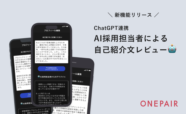 自分の経歴や実績をどのように表現すべきかという課題を抱える求職者が増えており、客観的なアドバイスを求める声が高まっています。この新機能は、最近注目を集めるOpenAI社が開発・公開した「ChatGPT」を用いて、求職者が自己紹介文を作成する際に、採用担当者がどのような情報を求めているかを理解し、自分だけでは見えない視点を提供することを目的として開発いたしました。また、Onepair内の調査では、自己紹介文を書くことで、オファーをもらえる確率が約15.4%上昇するという結果も出ており、より多くの機会を創出する目的も兼ねています。