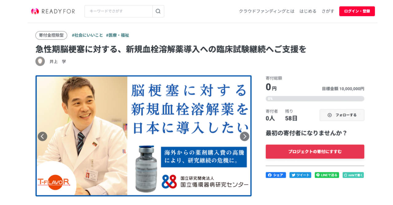 ・概要:血栓溶解薬テネクテプラーゼ導入に向けた研究費用を募ります。脳梗塞に対するテネクテプラーゼの治療効果が海外の複数の臨床試験で示され従来のアルテプラーゼよりも血管開通率・日常生活自立度も改善したと報告があります。しかし国内には、テネクテプラーゼを取り扱う製薬企業がなく国内開発の目処が経たない状況が続いています。海外とのドラッグラグを防ぎ、急性期脳梗塞の新たな血栓溶解薬開発のために、国循が中心となり、2021年から国内14医療施設が共同して医師主導臨床試験を実施しています。昨今の物価高、ウクライナ危機による世界輸送の高騰化の影響で、米国より購入している血栓溶解薬「テネクテプラーゼ」が研究開始当初より1.6倍程度の薬価に膨らんでおり、従来の研究費用では賄えない状況となり、今回クラウドファンディングに挑戦します。