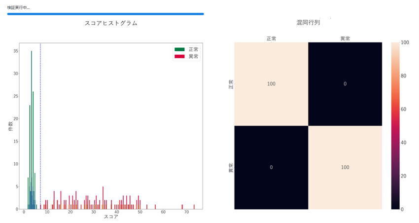 正常品の画像と異常品の画像を判定用データにアップロードすると、画像に対して特徴量から算出されたスコアが付与され、ヒストグラムとして表示されます。
