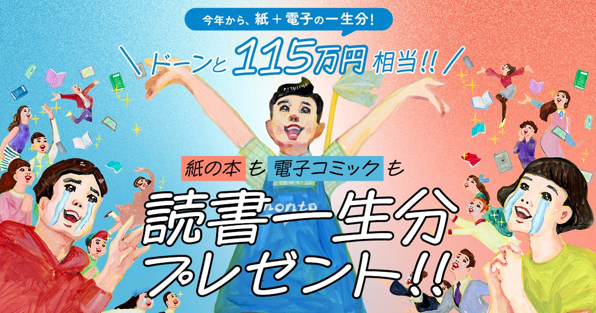 「読書一生分」の金額は、「一世帯当たりの書籍・雑誌等の年間支出額」に日本人の「平均寿命」を掛けて算出しています。今年はお客様の変化する読書スタイルを考慮し、「一世帯当たりの電子書籍への年間支出額」を加えた計算式を採用し、「読書一生分115万8,901円」相当のhontoポイントを抽選で1名にプレゼントします。