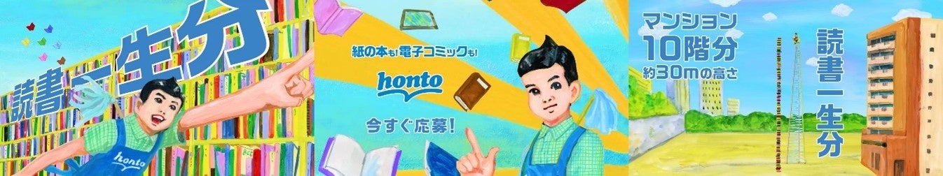 イラストレーターの五月女ケイ子さんが描き下ろした動画広告を期間限定でYouTubeに再公開します。honto書店員のキャラクターが本好きの人々に「読書一生分キャンペーン」をお知らせする様子や、「読書一生分」相当の金額で買える本の多さをマンションの高さなどで表現するユニークな内容で1等「読書一生分115万8,901円」の物量イメージに注目です。