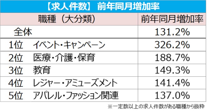 また、[イベント・キャンペーン]が1,538円(前月比:+33円、前年同月比:+71円)で、求人件数は前年同月比で約3.3倍の増加となった。