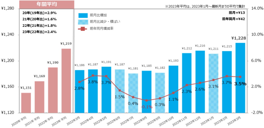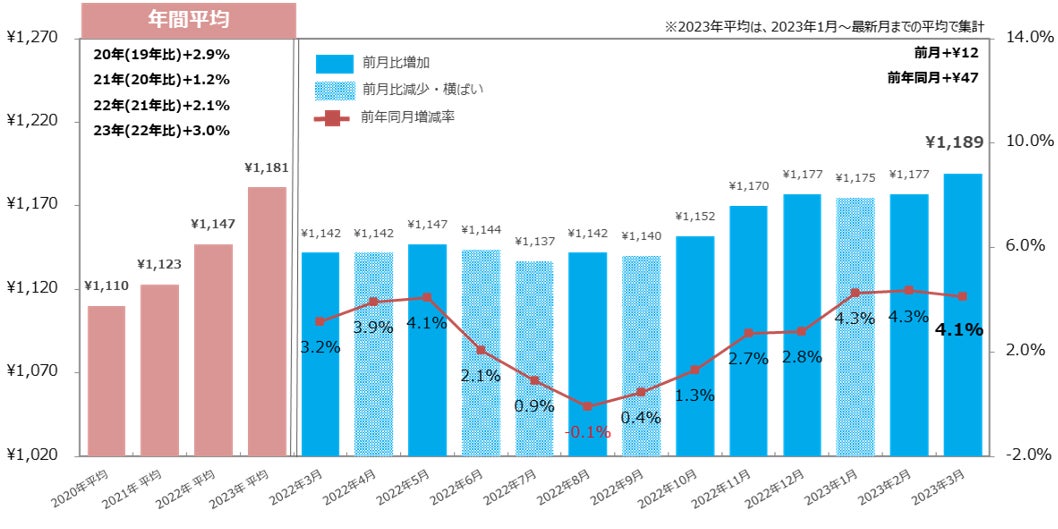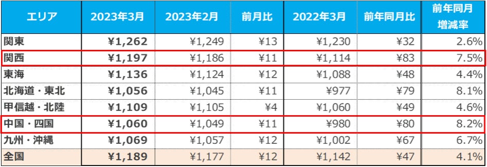 「関西」では1,197円(前月比:+11円、前年同月比:+83円)、「中国・四国」では1,060円(前月比:+11円、前年同月比:+80円)となり、2エリアで前年同月比80円以上の大幅な増加となった。【図4】