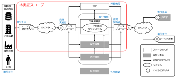 現在、無体物であるデータは民法上の権利(所有権、財産権等)対象外であり、⼀般的には財産保護の対象にはならないことがデータ取引市場の阻害要因の一つになっております。そこで、データ保有者が第三者にデータを提供し、データを提供された者が、新たな経済活動に向けてそのデータを利用し財を得るという一連の営みにおいて、「データを利用する権利」を権利証書化し取引の対象とするとともに、信頼できる第三者機関(以下、「TTP」)によりその権利が保証される「データ利用権取引市場システム」が新たに開発され、MILIZEはデータ流通における問題解決への協力とブローキング業務の研究の為、参加しました。