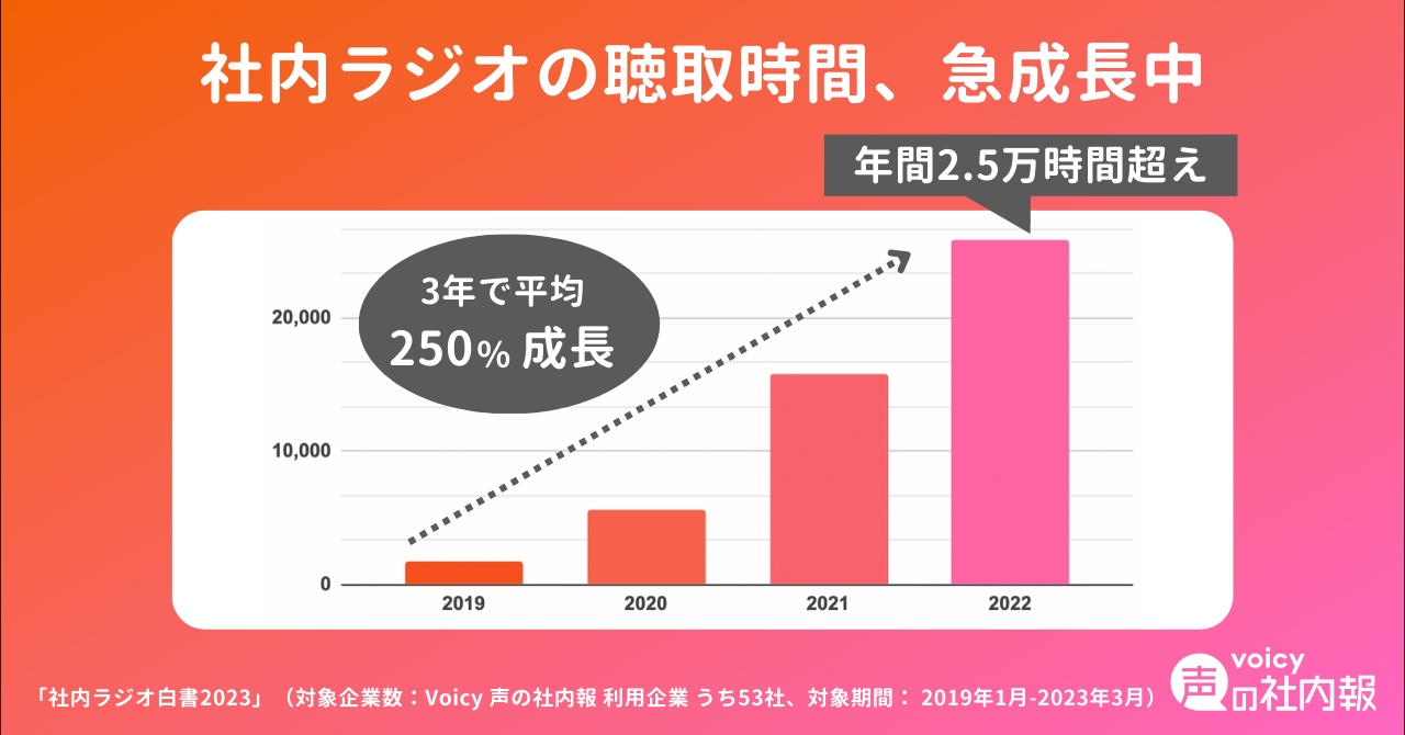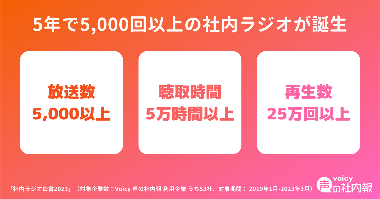 2023年現在、過去5年間の放送数は5,000回を突破、合計聴取時間は5万時間を突破し、再生数は25万回を超えました。多くの社内ラジオが生まれ、企業内で実際に聴かれていることがわかります。