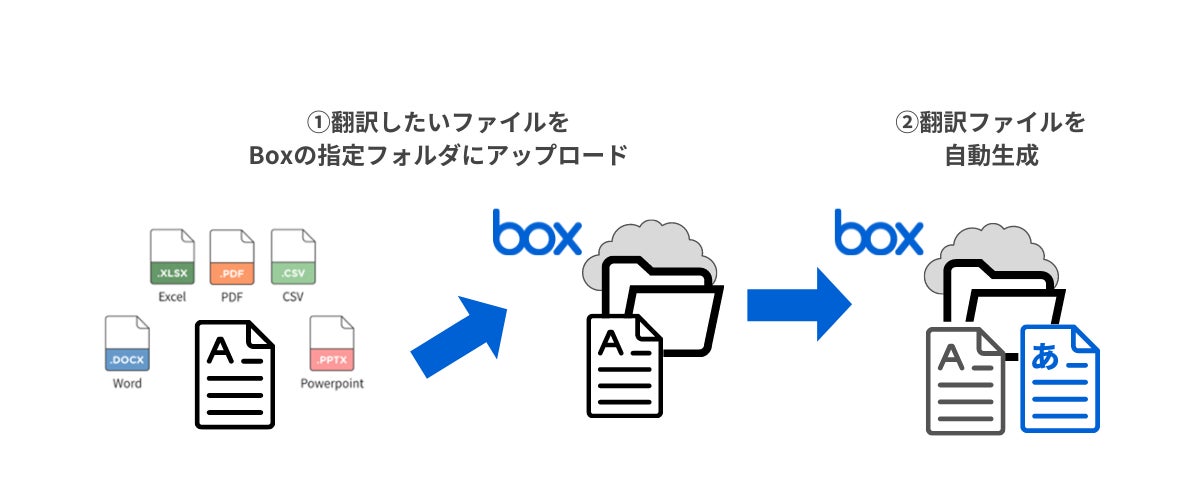 煩雑なファイルアップロード・ダウンロードの工程をなくし、セキュアな環境下で自動的にAI翻訳を実行。生成された翻訳ファイルをそのまま共有できるサービスです。Box内の指定フォルダにアップロードされたファイルは、定期的にAI翻訳が行われ、翻訳ファイルが自動生成されます。