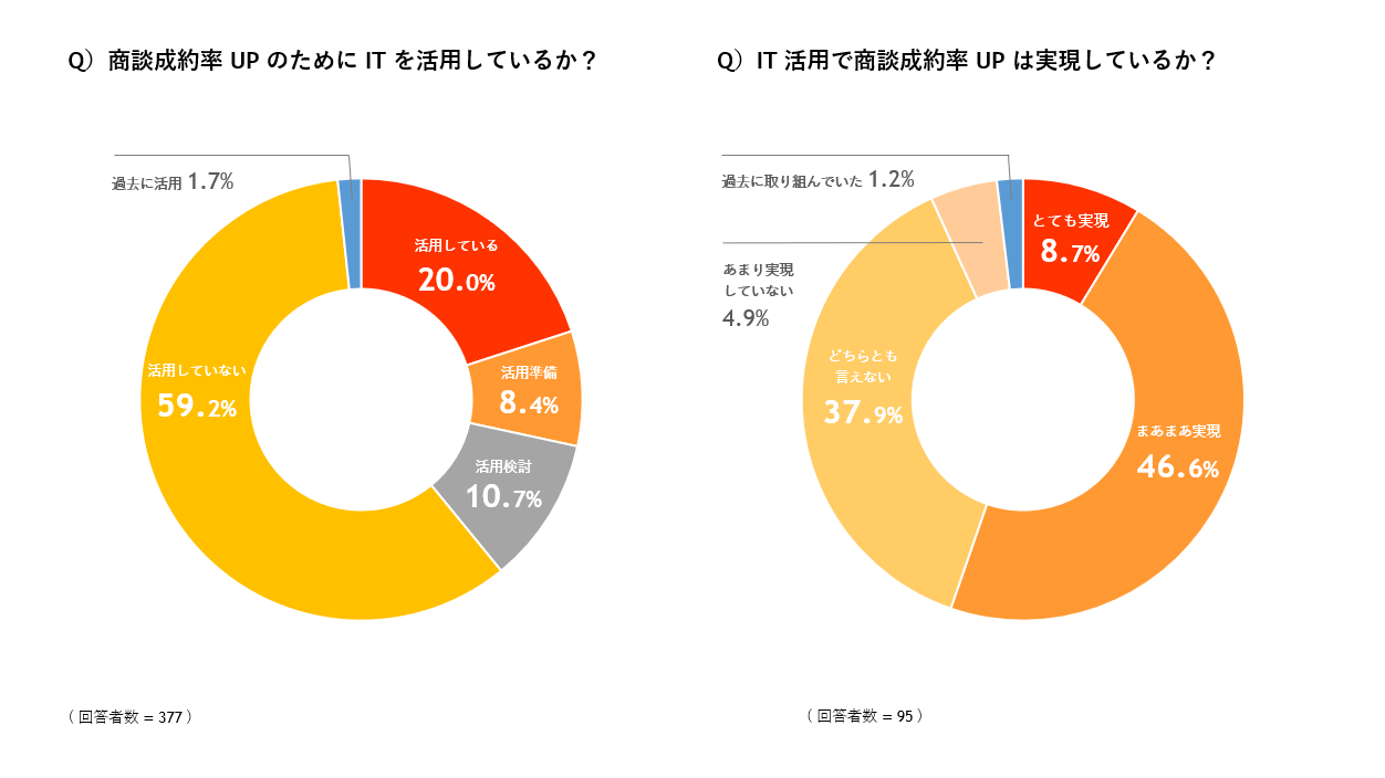 - 商談成約率UPのためにITツールの活用(検討・準備含む)は39.1%、実際に商談成約率UPを「実現している」は55.3%