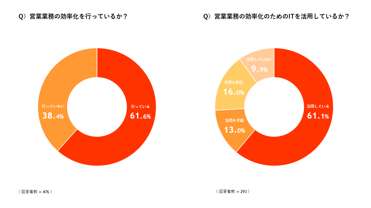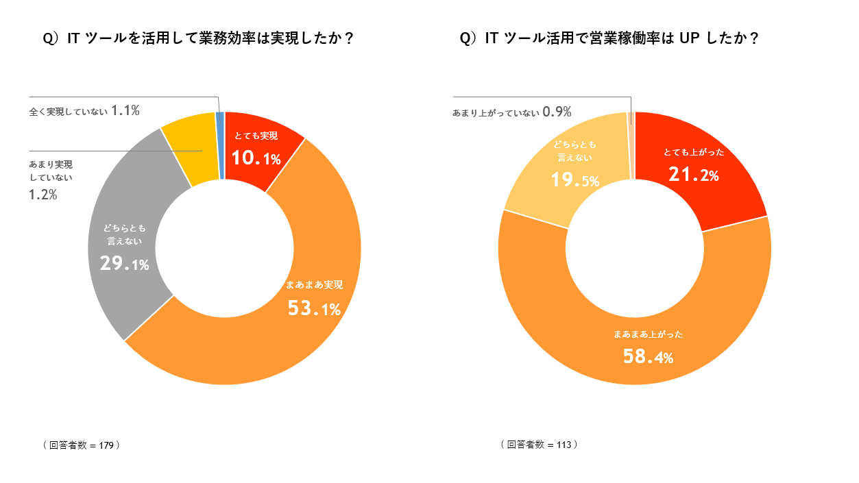 - ITツールを活用して営業業務の効率化を「実現している」は63.2%、営業業務の効率化によって「営業稼働率が上がった」は79.6%