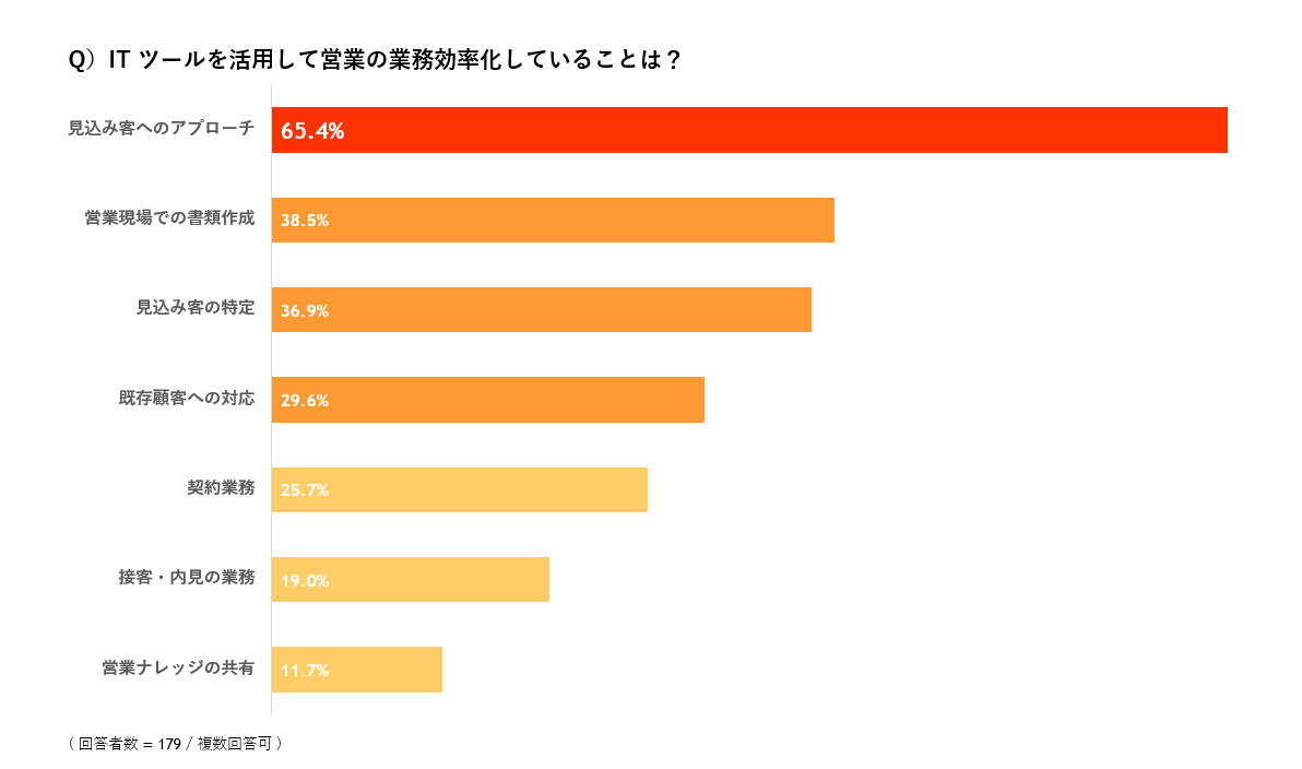ITツールを活用して営業業務の効率化を行っていると回答した方へ、どのような営業業務を効率化しているかについて質問したところ、「見込み客へのアプローチ」が最多で65.4%、「営業現場での書類作成」が38.5%、「見込み客の特定」が36.9%となりました。