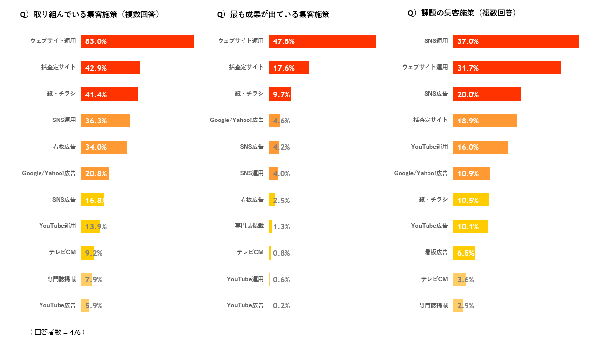 - 取り組んでいる集客施策は「ウェブサイト運用」が最多で83.0%、「一括査定サイト」が42.9%、最も成果がでている集客施策は「ウェブサイト運用」が47.5%、課題に感じている集客施策は「SNS運用」が最多で37.0%