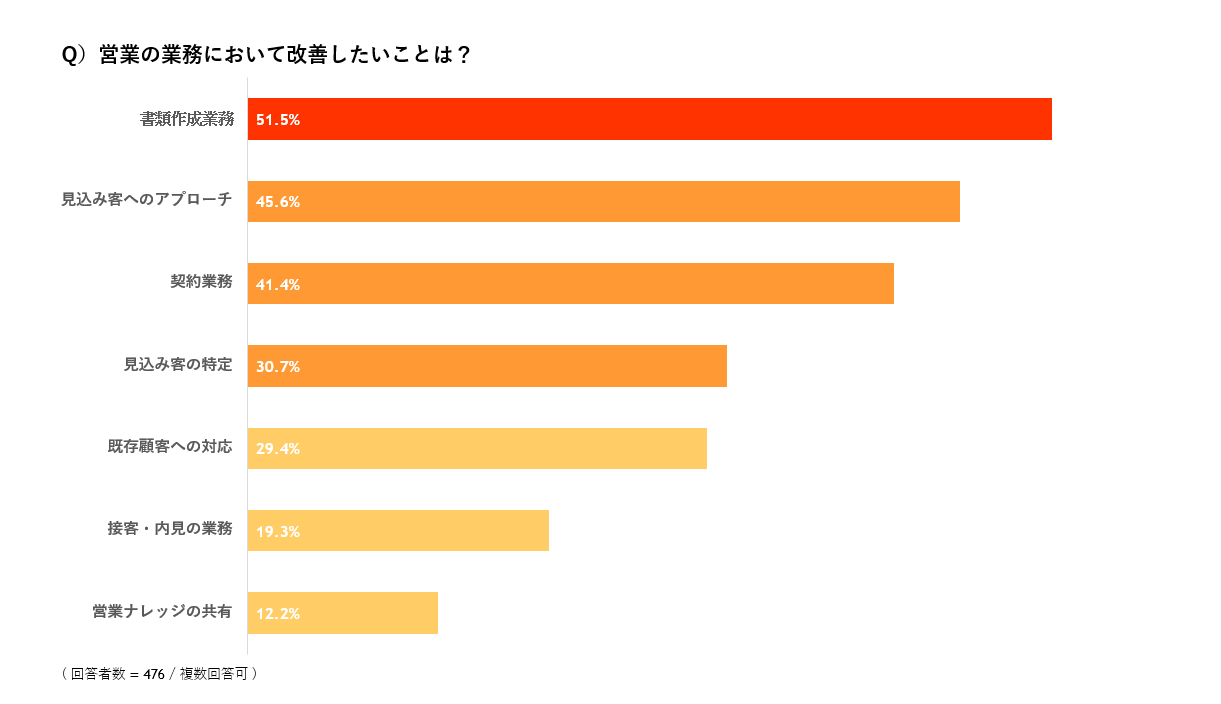 不動産事業者に、営業の業務で改善したいことについて質問したところ「書類作成業務」が最多で51.5%、「見込み客へのアプローチ」が45.6%、「契約業務」が41.4%となりました。