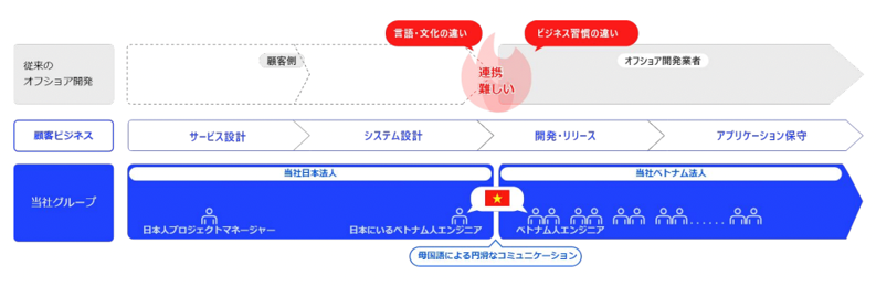 当社の提供するサービスは、日本とベトナムのリソースを融合させ、顧客のビジネスとテクノロジーという両側面からDXを推進する「ハイブリッド開発」です。ハイブリッド開発においては、コミュニケ―ションの仲立ち役である、日本人PMとベトナム人PMの豊富な経験から、従来のオフショアでありがちなコミュニケーションの齟齬などを防ぎます。実際のサービス設計フェーズにおいては、UCD(実際にサービスを利用するユーザーの使い方を元にデザイン・インターフェイスを作成)によるUI・UXデザインを提供し、実装のフェーズではアジャイルスクラム開発を取り入れ、計画、開発、テスト、リリースを繰り返すことにより、高品質かつスピーディな開発を実現します。このように、サービス設計からエンハンスまでワンストップでサービスを提供することで、クライアントへ貢献いたします。