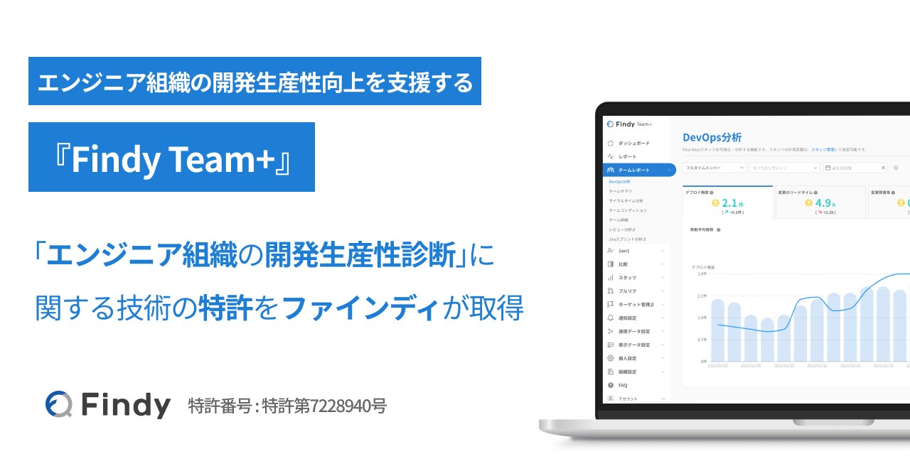 ファインディ株式会社(本社:東京都品川区、代表取締役:山田裕一朗 以下「当社」)は、エンジニア組織における開発生産性を自動で可視化するサービス「Findy Team+(チームプラス)」で使用されている、「エンジニア組織の開発生産性診断」に関する技術の特許を取得したことをお知らせします。