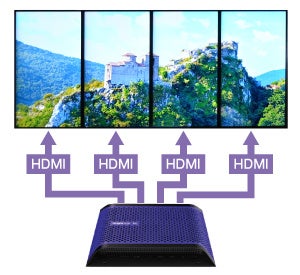 最大4つのHDMIコネクターを搭載し、複数のディスプレイに出力します。マルチディスプレイを利用したサイネージを一台で実現できます。